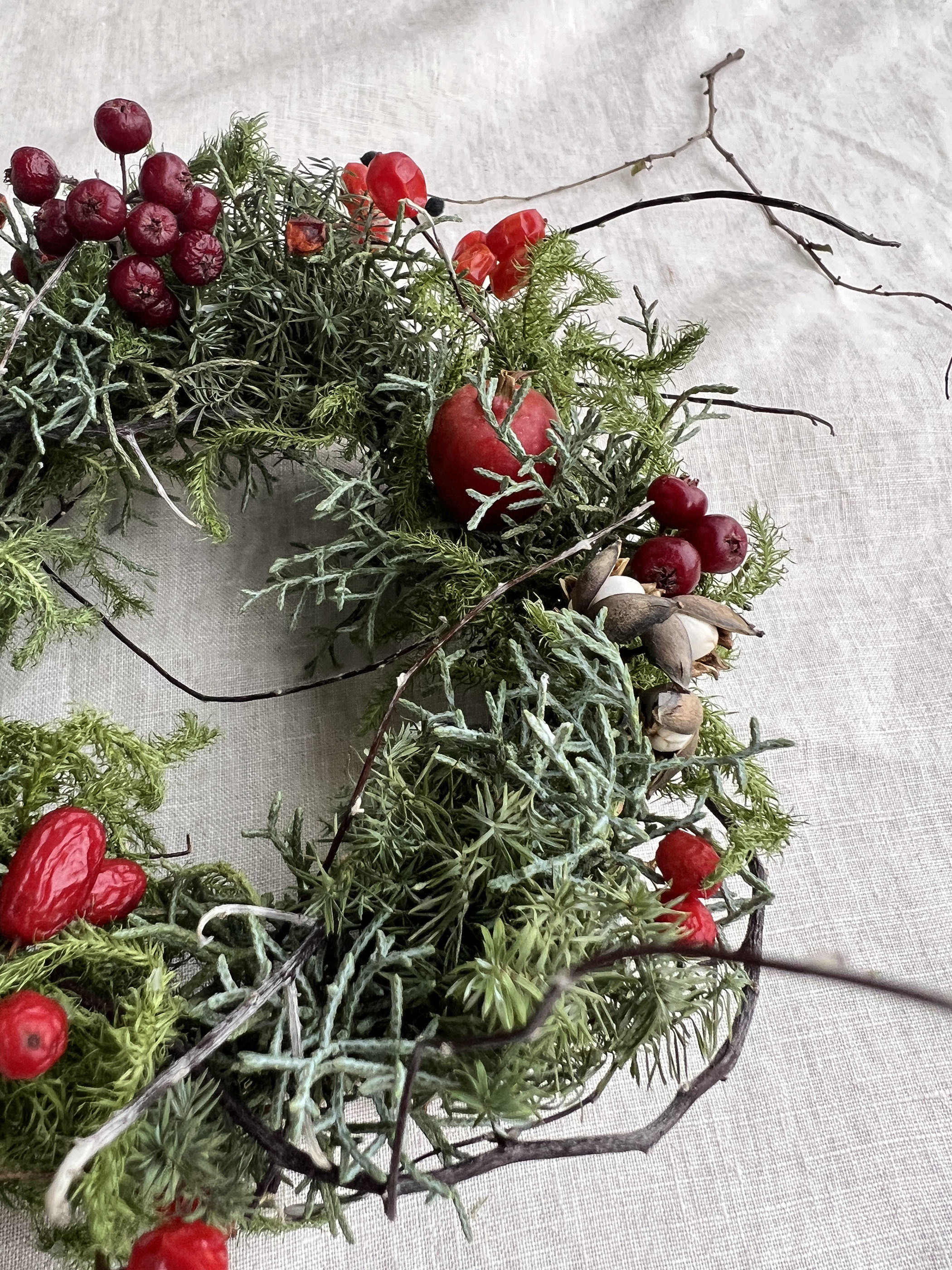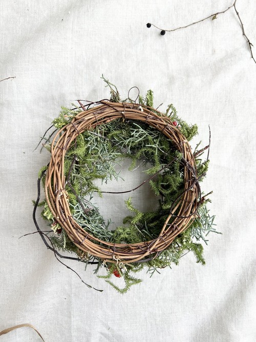 シンプルに仕上げているのでクリスマスが終わってからも楽しめる、一年中飾れるリースです