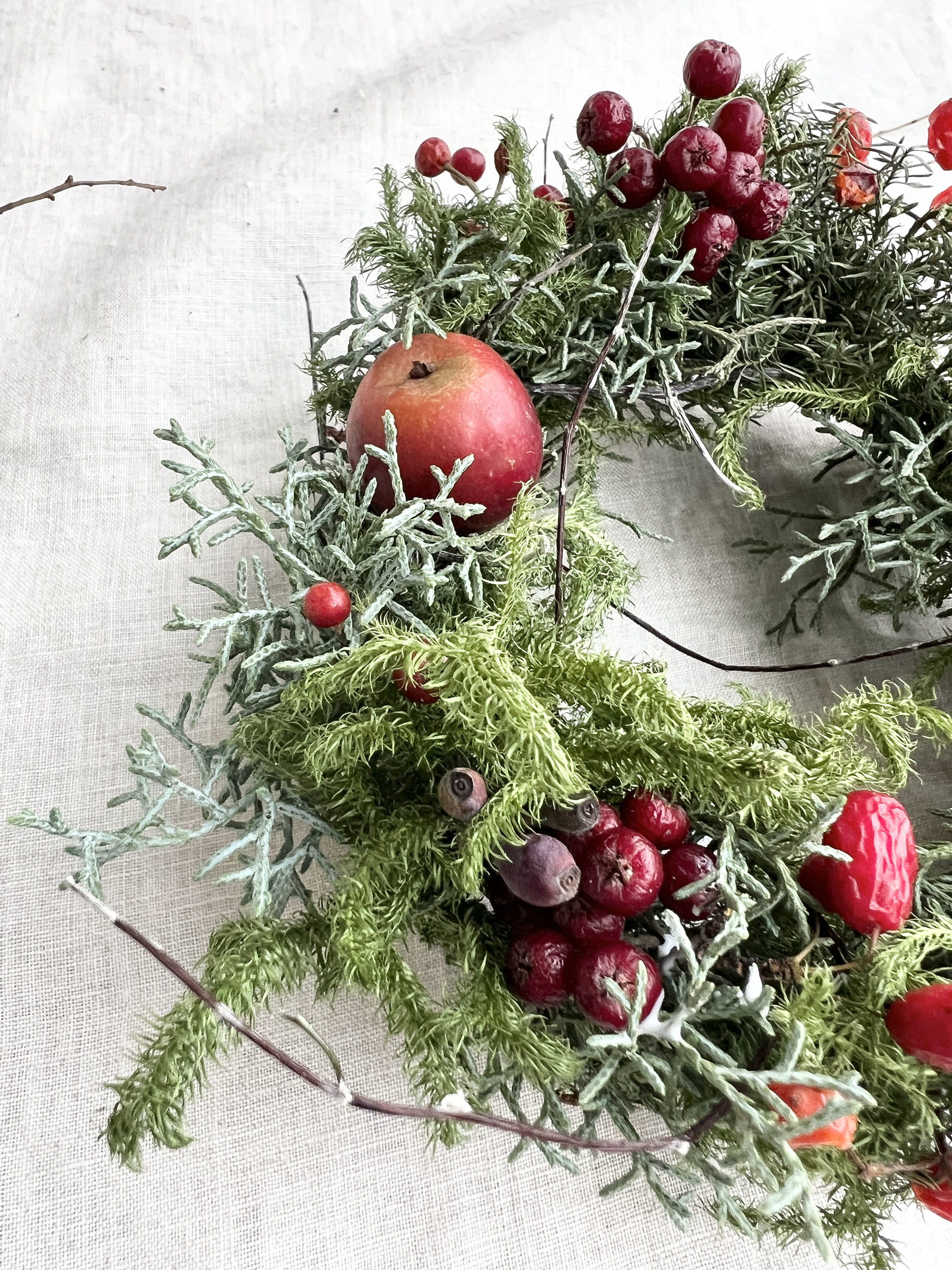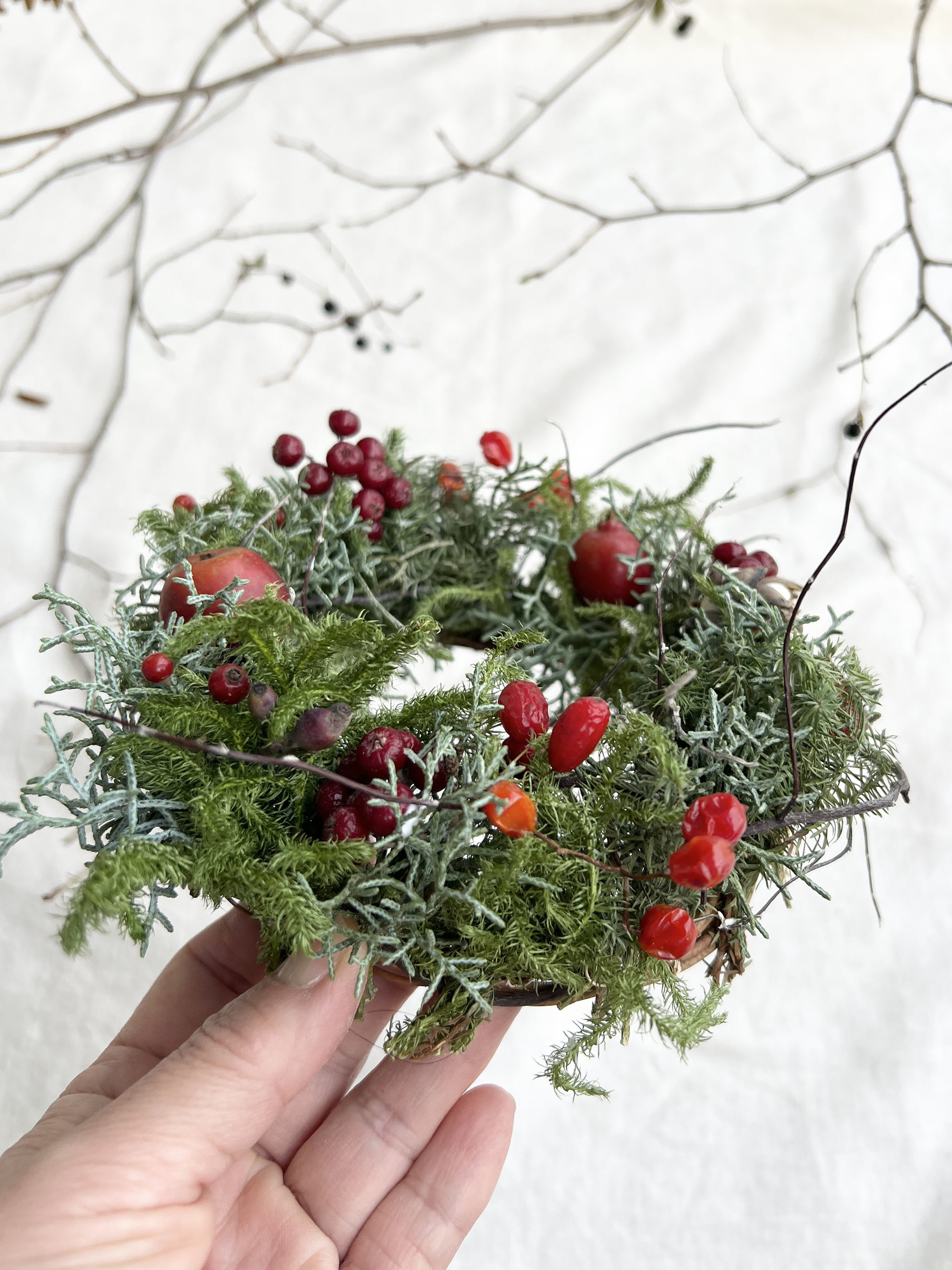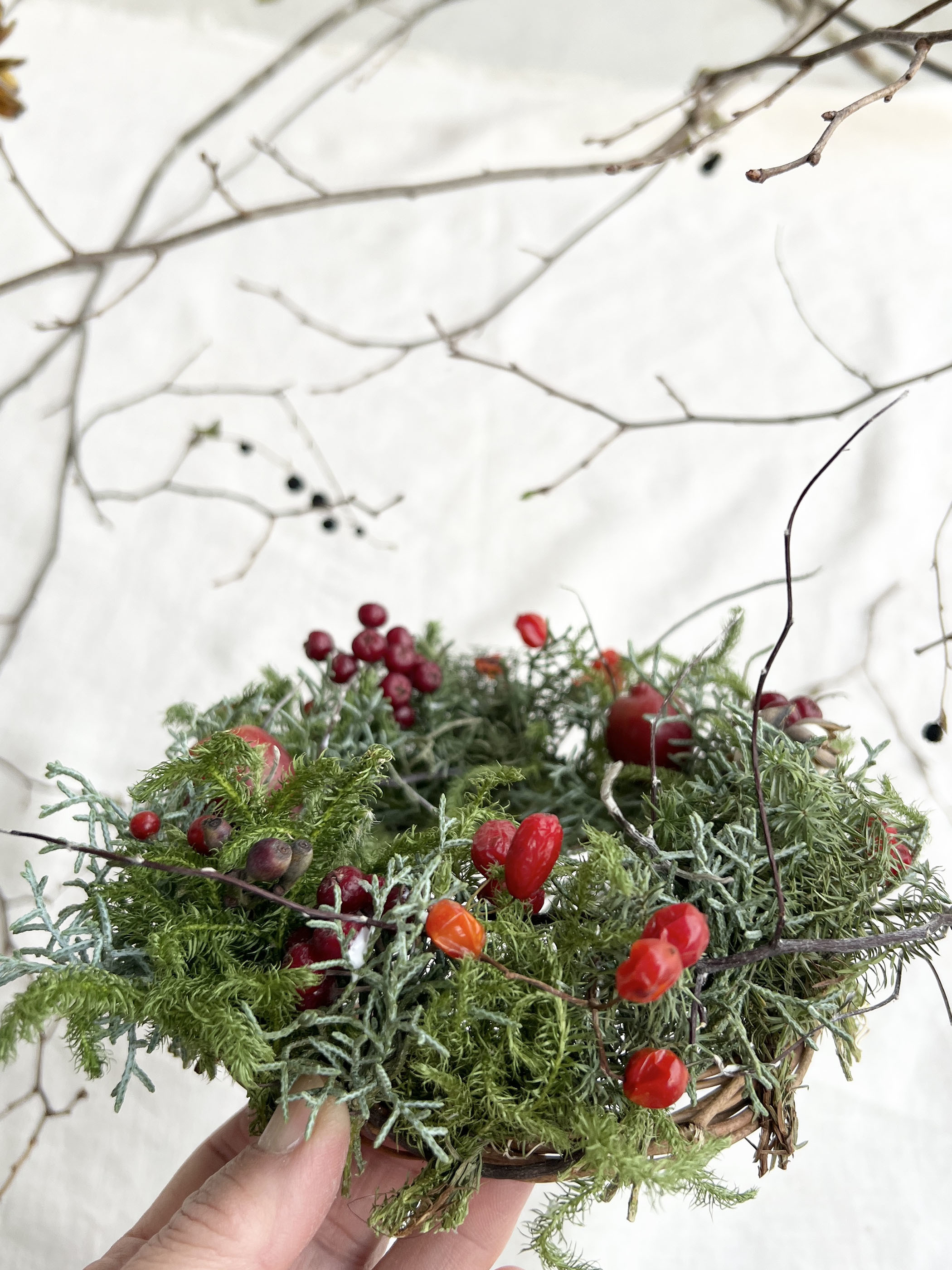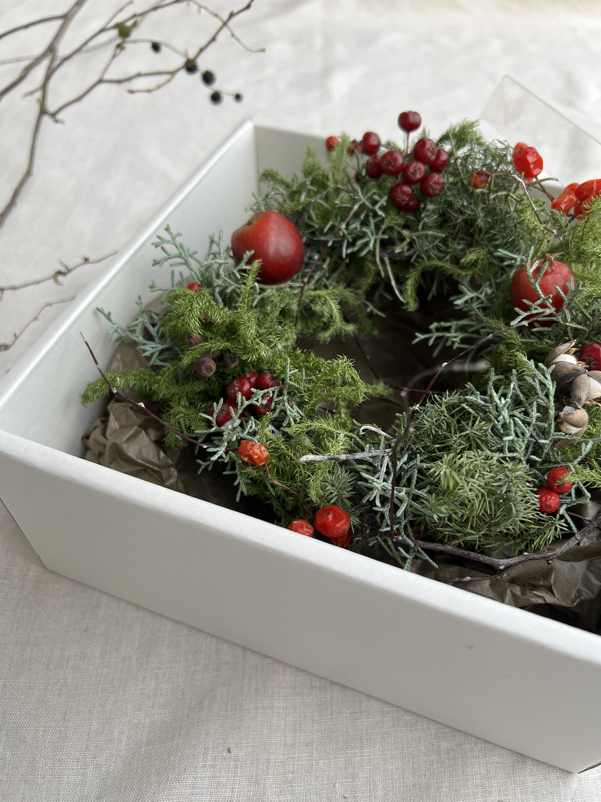 柔らかなヒカゲノカズラと香りのいい針葉樹を中心に赤い実を組み合わせ、自然の息吹をそのまま閉じ込めました