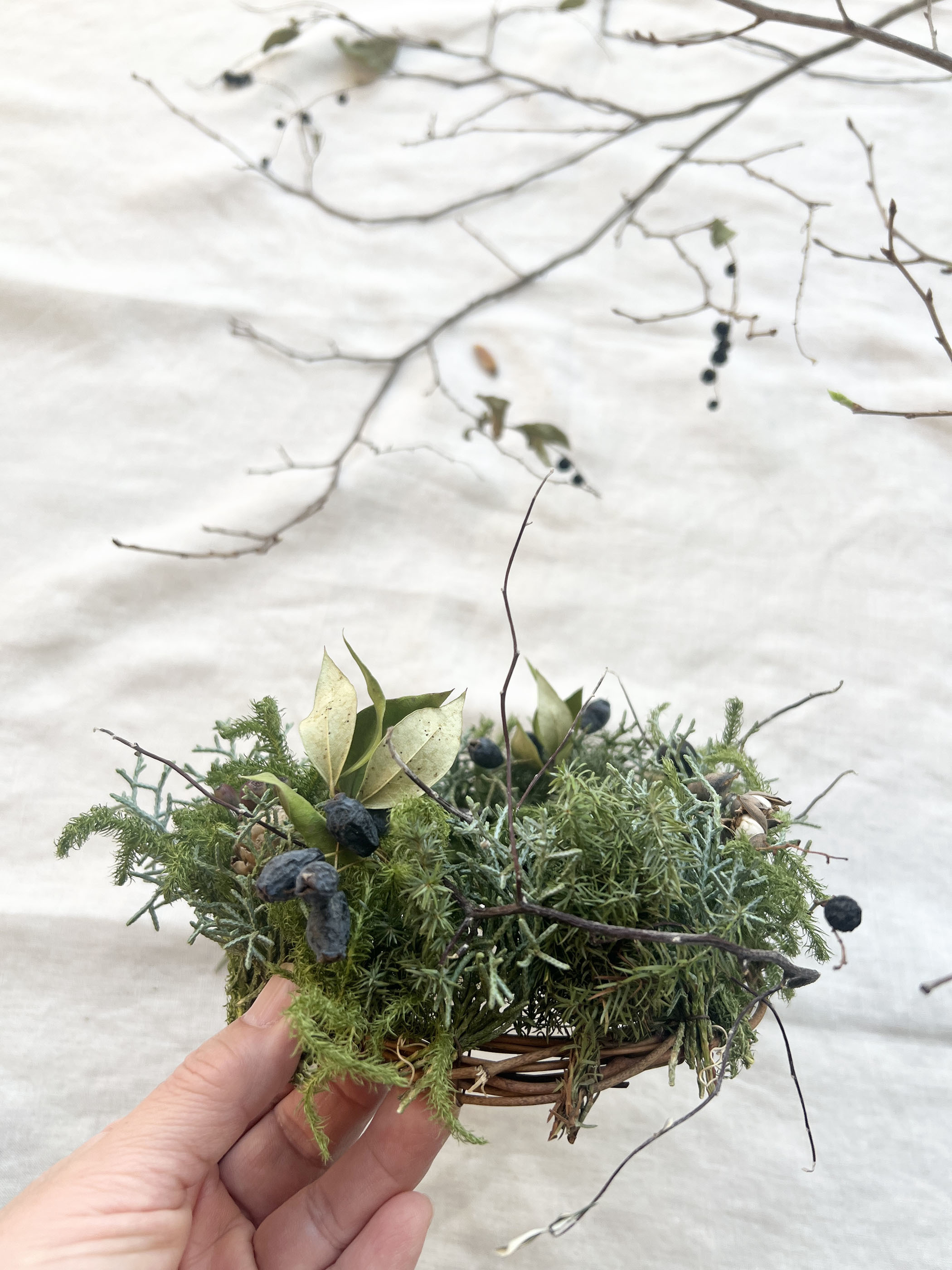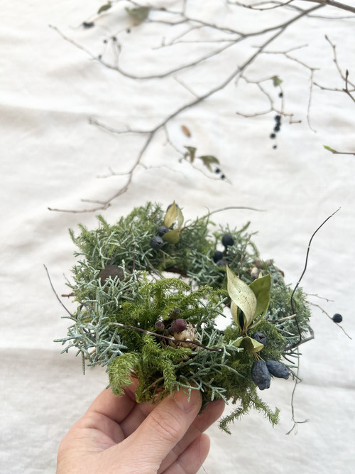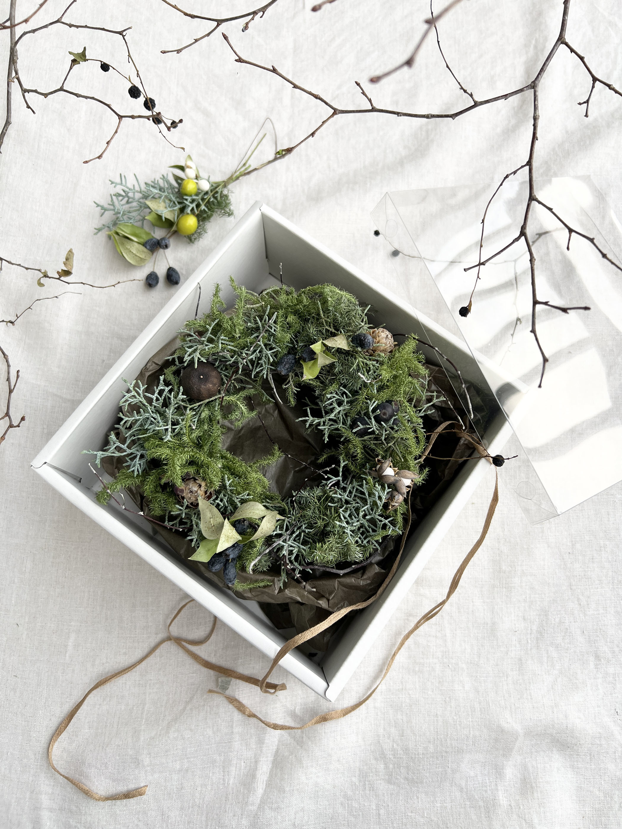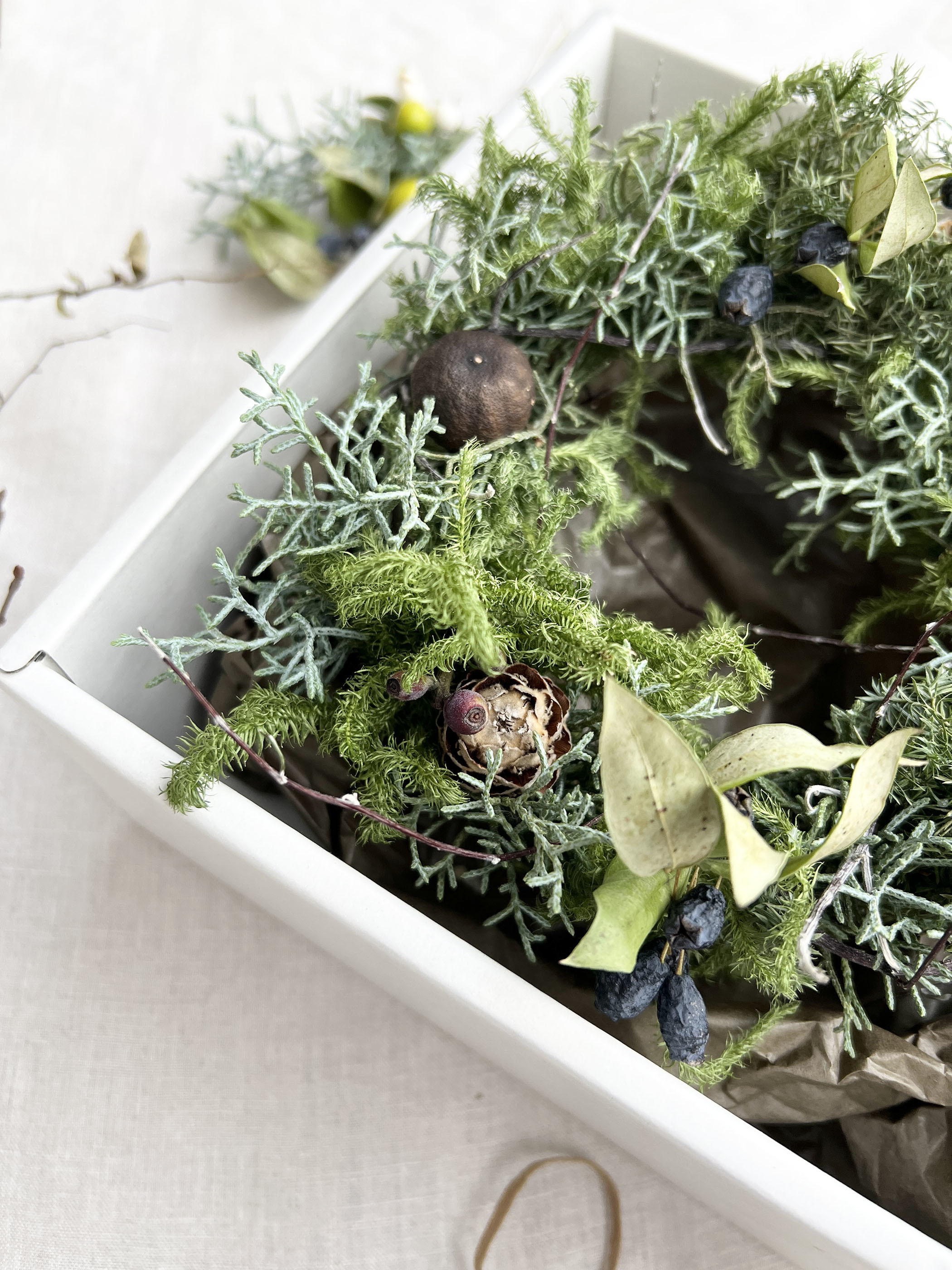 ヒカゲノカズラと針葉樹はワイヤーで丁寧に制作してますので、時間がたっても崩れにくく長く飾って頂けます。お手元にはセミドライの状態でお届けいたします