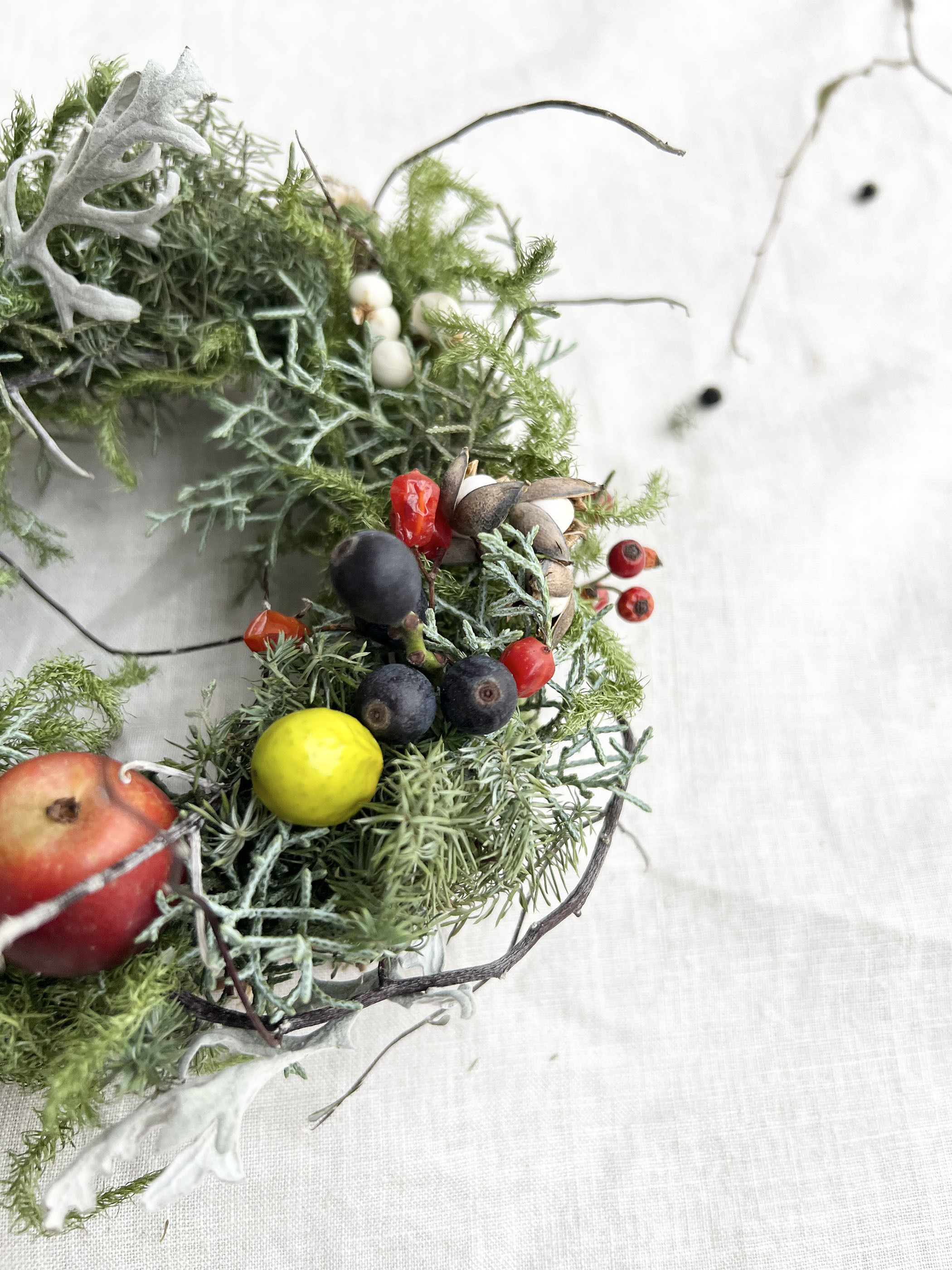 シンプルに仕上げているのでクリスマスが終わってからも楽しめる、一年中飾れるリースです