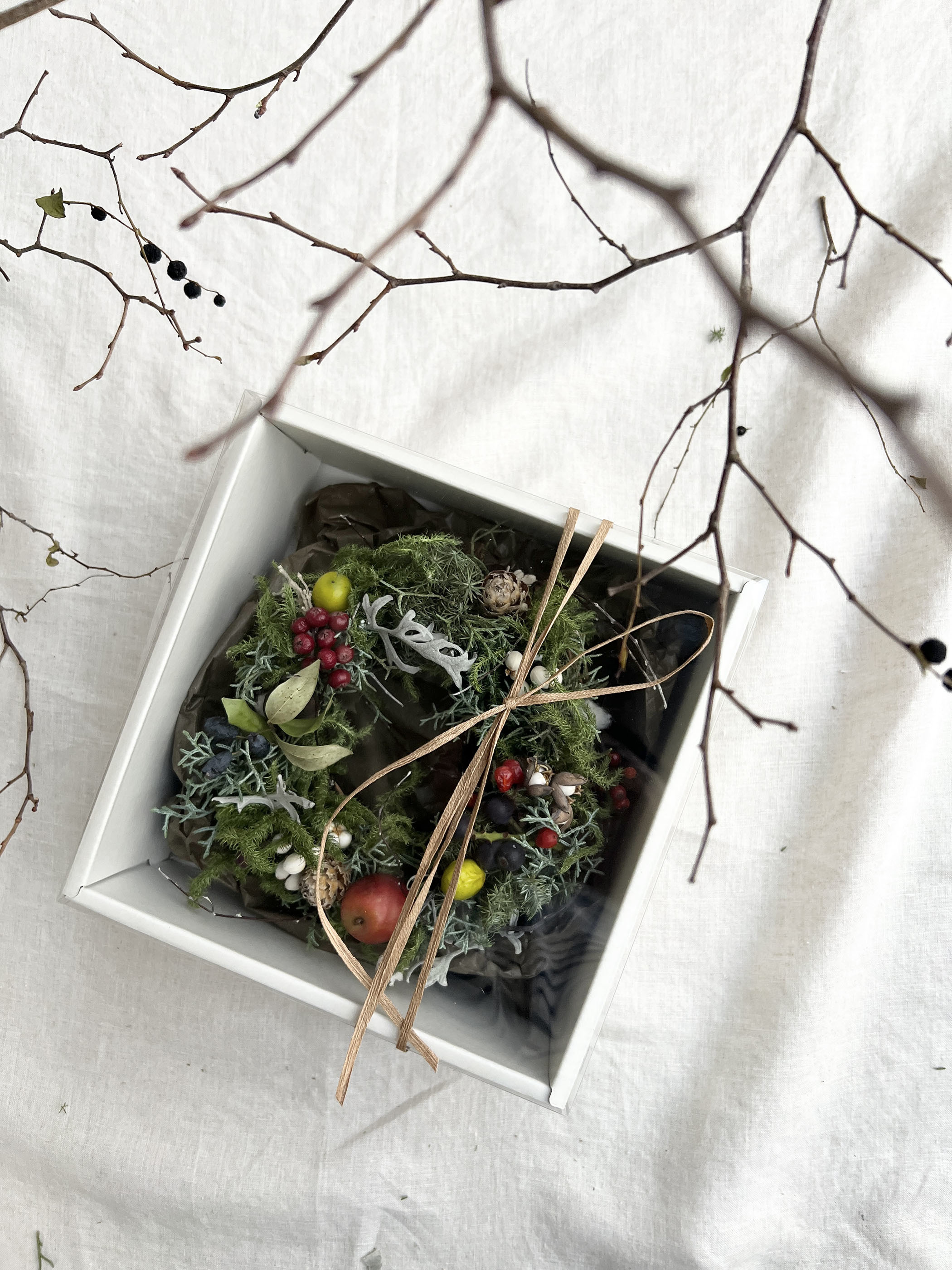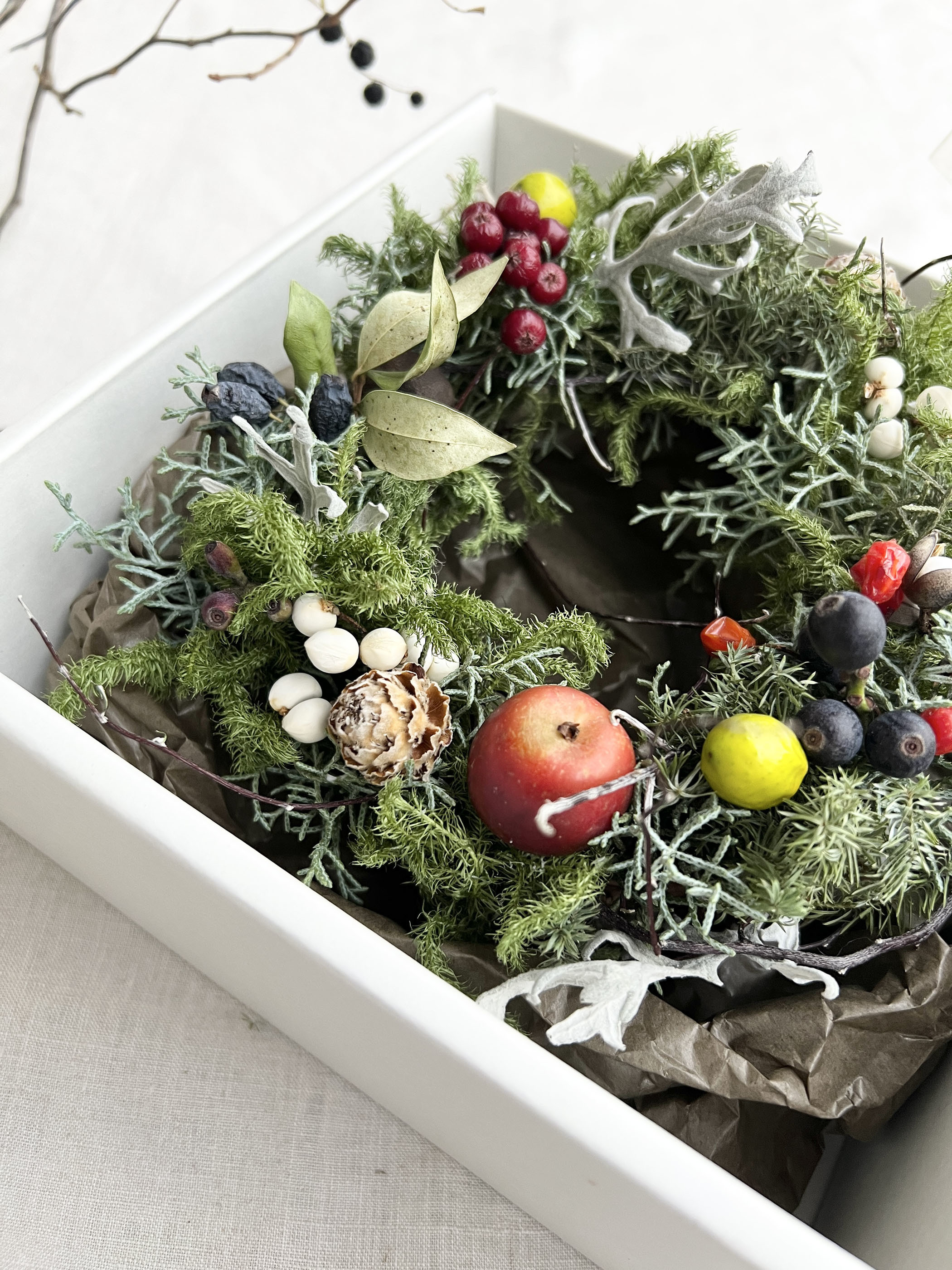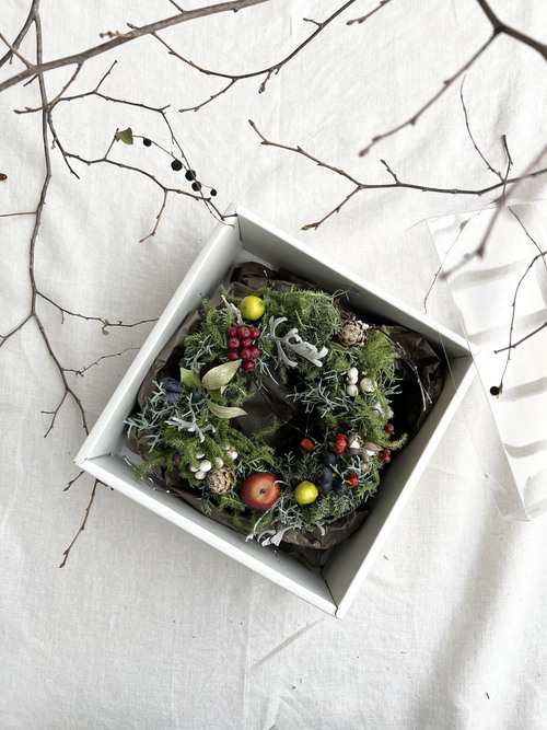 ヒカゲノカズラと針葉樹はワイヤーで丁寧に制作してますので、時間がたっても崩れにくく長く飾って頂けます。お手元にはセミドライの状態でお届けいたします