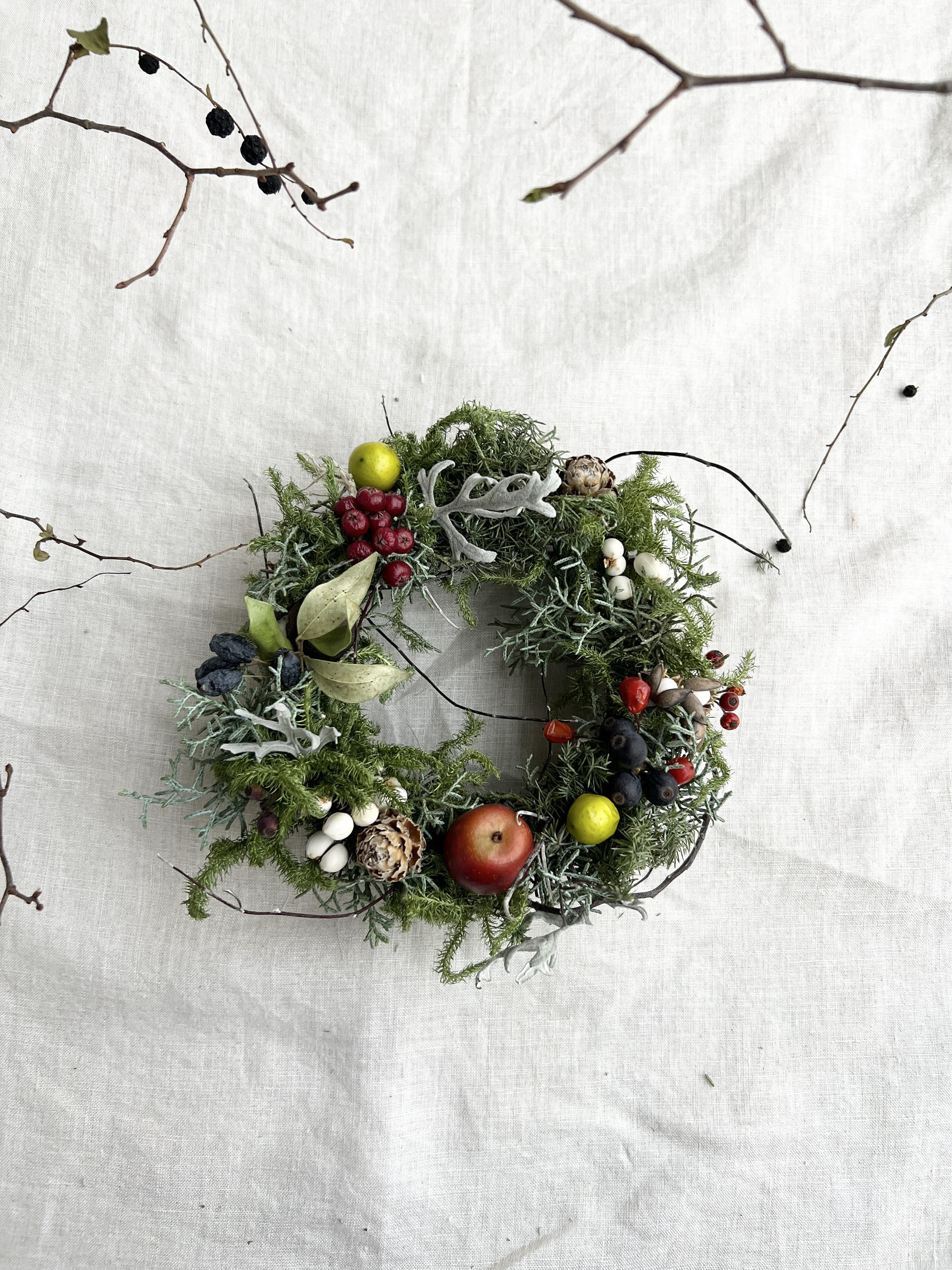柔らかなヒカゲノカズラと香りのいい針葉樹を中心に冬の植物を色々組み合わせ、自然の息吹をそのまま閉じ込めました